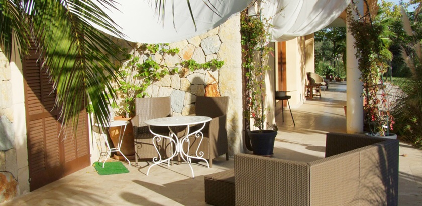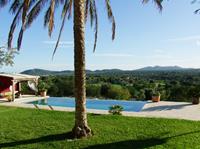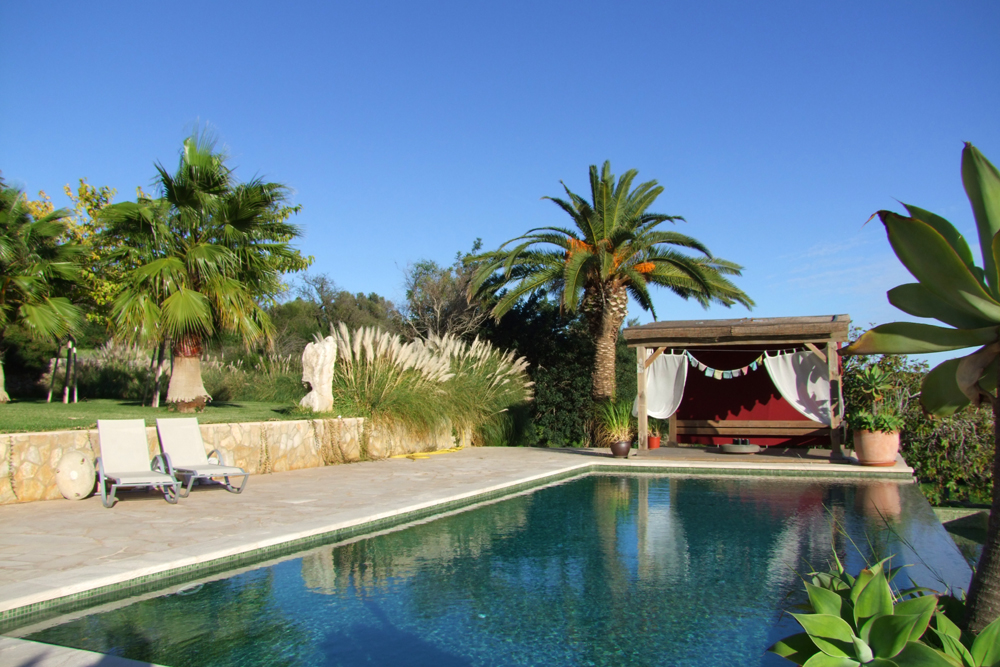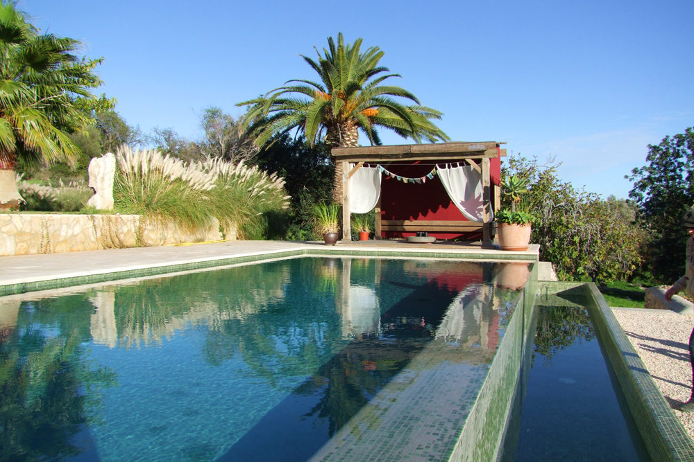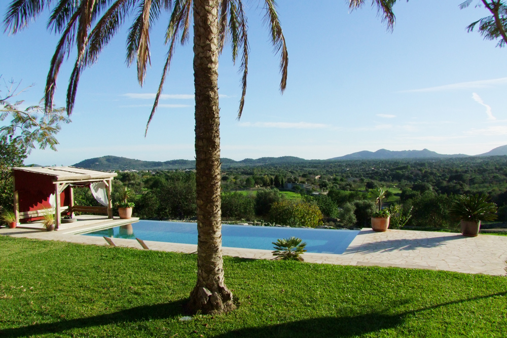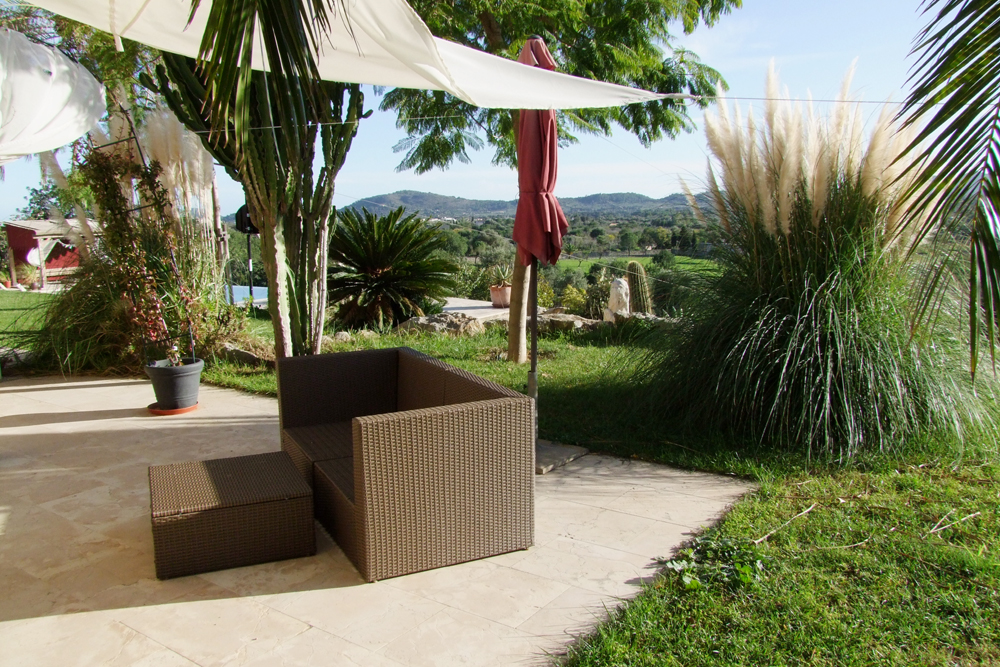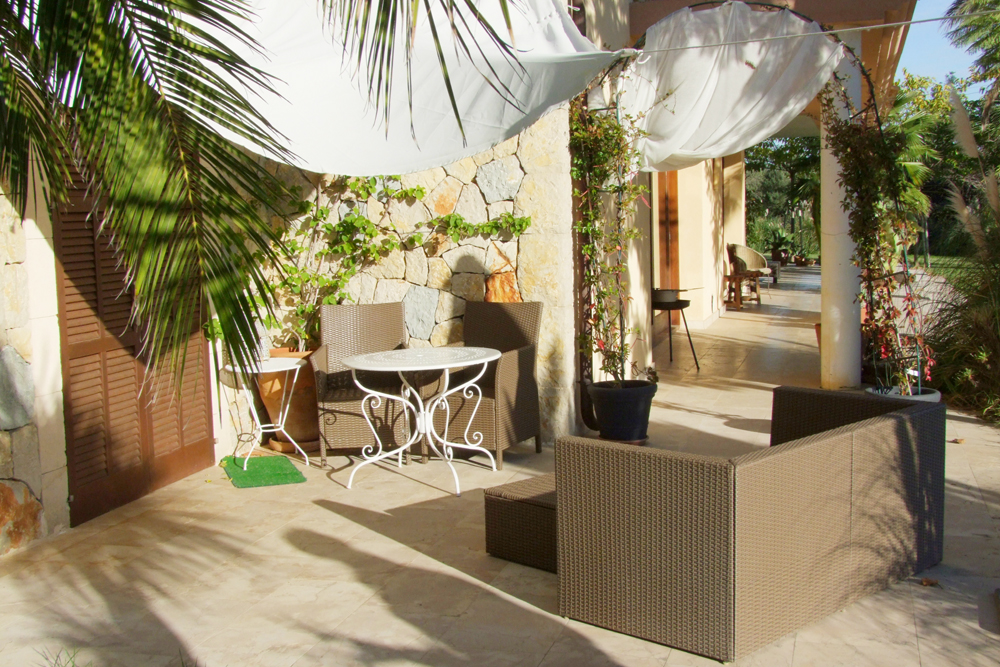 Von der grossen überdachten Terrasse blickt man auf den Garten mit zahlreichen Obstbäumen und mächtigen Palmen, wie auch das Salzwasserschwimmbad welches sich harmonisch in die Gartengestaltung einbettet.
