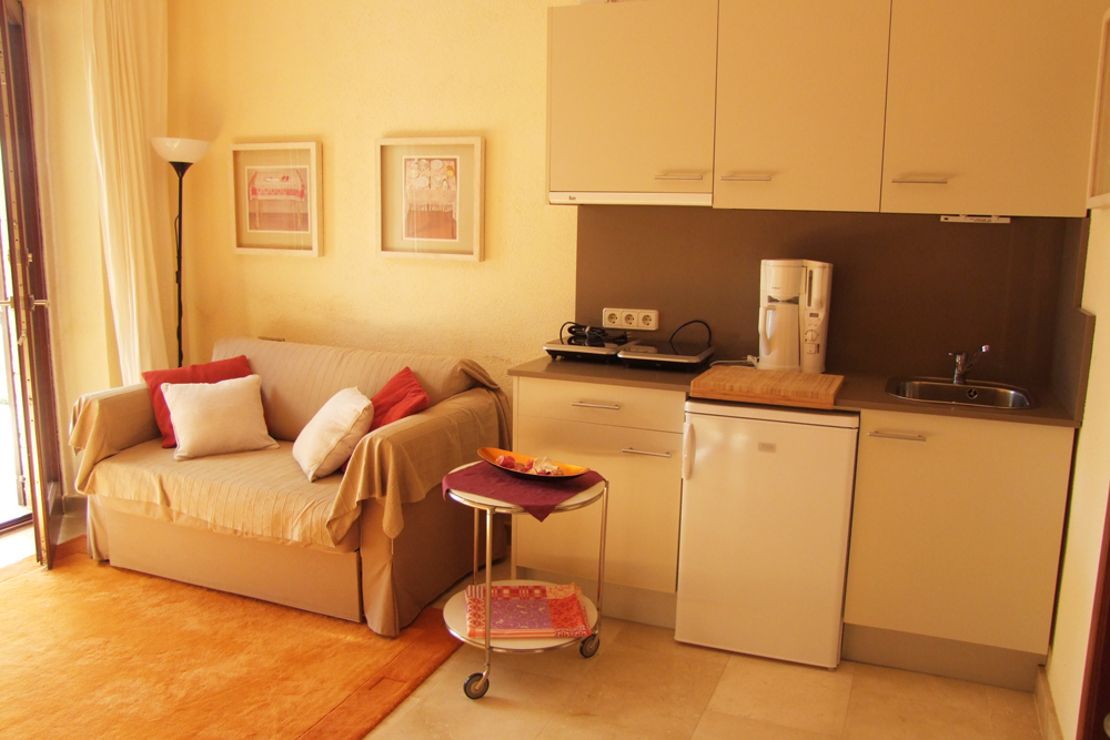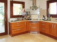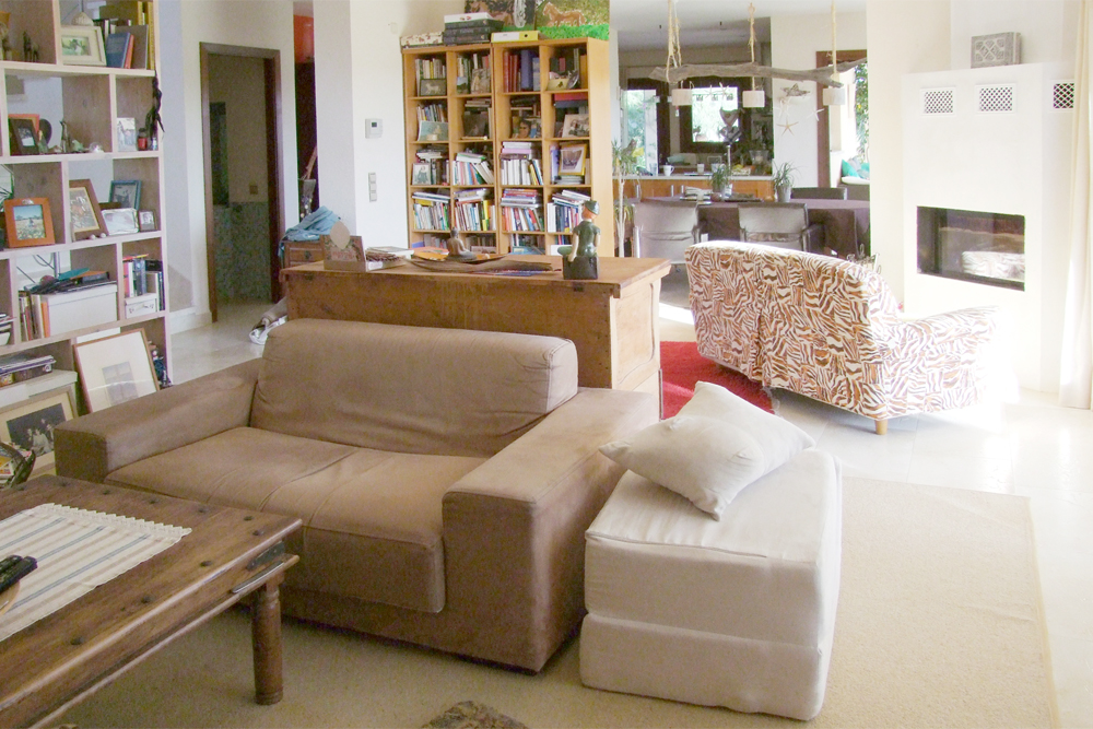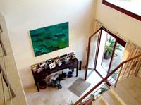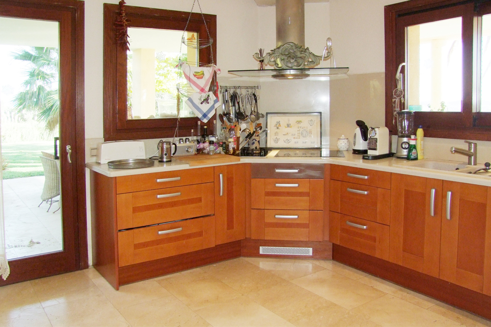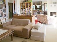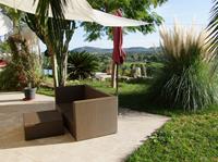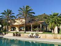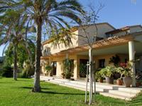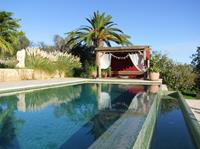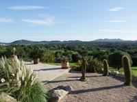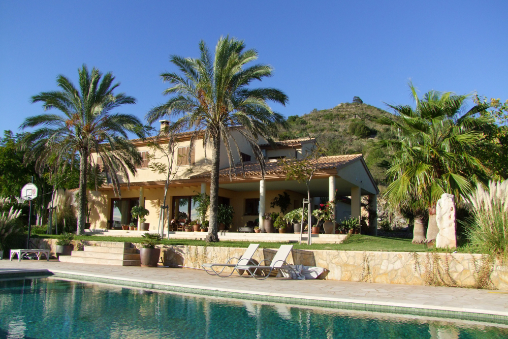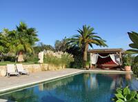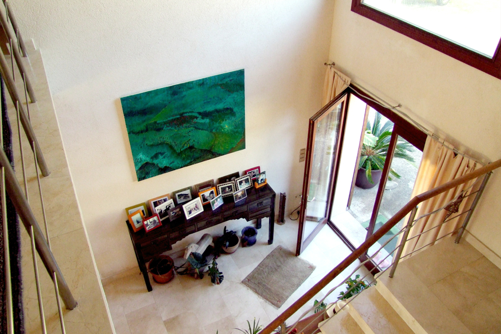 Von der grossen überdachten Terrasse blickt man auf den Garten mit zahlreichen Obstbäumen und mächtigen Palmen, wie auch das Salzwasserschwimmbad welches sich harmonisch in die Gartengestaltung einbettet.