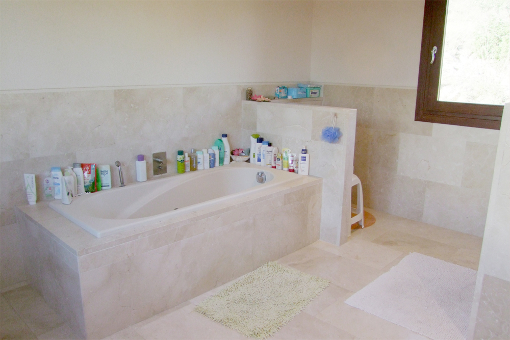 Das gesamte Wohnhaus ist mit italienischen Marmor ausgelegt, welcher stilvoll dezent matt gehalten wurde. Zudem verfügt das Objekt über Fussbodenheizung, öffentlichen Stromanschluss und der 160 m tiefe Brunnen gewährleistet ganzjährig genug eigenes Wasser.